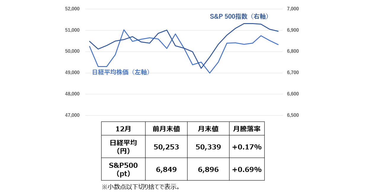 2025年12月の日経平均株価は横這いで推移しました。今年度の上昇をけん引してきた半導体関連銘柄の調整や12月の日銀政策決定会合での利上げが株価の重しとなり、月前半は50,000円を割れる展開もあったものの、月末にかけては買戻しが入り、前月末対比でほぼ横ばいで引けました。