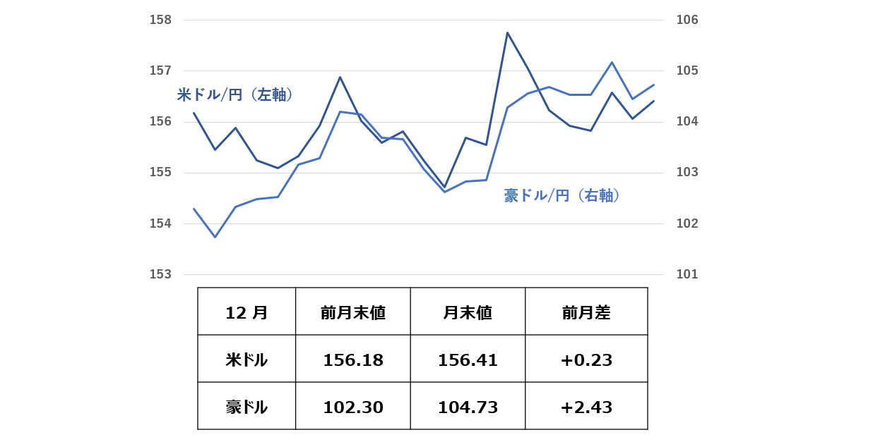 2025年12月のドル円相場は、概ね横ばいで推移しました。12月は、日本で利上げが実施される一方、米国では利下げが行われ、日米金利差の縮小を背景に円高が進む局面も見られました。しかし、高市政権による財政拡大への期待が意識される中、円安圧力も根強く、相場は方向感に欠ける展開となりました。結果として、前月比ほぼ横ばいの156円台で月末を迎えました。