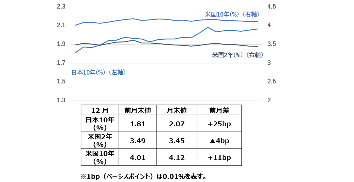 2025年12月の日本10年国債利回りは、月初の1.80%台から月末には2.00%を超えました。12月の日銀金融政策決定会合では0.25%の利上げが発表され、今後も利上げが継続される可能性が示唆されたことが、金利上昇の主因となりました。加えて、高市政権による積極的な財政政策を背景に、中長期的なインフレ率上昇への警戒感が強まり、長期金利は大幅な上昇となりました。