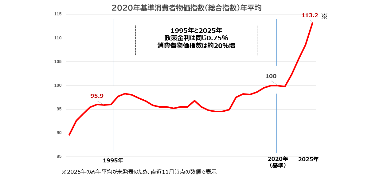 一方で、同じ金利水準にあった30年前の為替を見てみると、実は1995年4月には円の1ドル75円台を記録し、9月には100円台まで戻るという激変の年でした。また、それに伴う物価水準(2020年基準消費者物価指数)は下のグラフの通り、2025年と1995年を比較すると約20%上昇していることが見て取れます。個別商品で言えば、当時100円だった缶コーヒーが150円程度へ、うまい棒は現在15円で販売されるなど、大幅に上昇している商品もあります。