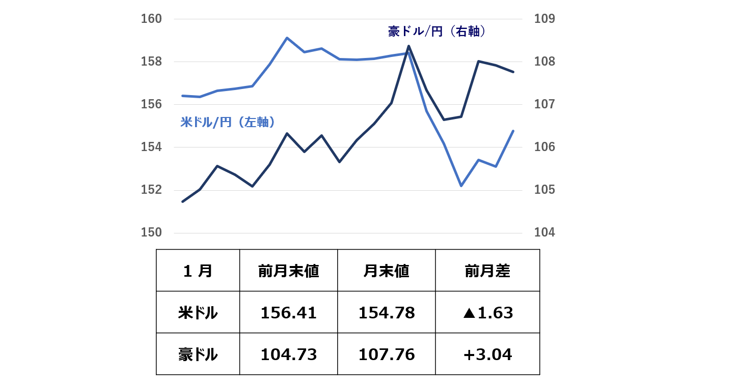 2026年1月のドル円相場は、高市首相による衆議院解散報道や消費税減税報道などを受けて一時159円台まで上昇しました。しかし、日米当局による為替介入への警戒感が高まる中で、ドル円は152円台まで急速に下落しました。その後、実際には介入が行われなかったことが判明、加えてFRB新議長によるタカ派的な金融政策姿勢が意識されたことで、ドル円は154円台まで持ち直す展開となりました。