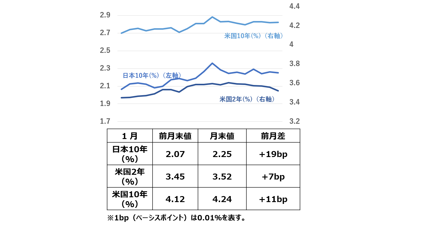 2026年1月の日本10年国債利回りは、月初の2.00%台から一時2.30%まで上昇しました。日銀が利上げ姿勢を継続するとの見方が根強い中、解散総選挙を巡る消費税減税観測などを背景に、将来的な財政拡大への懸念が強まりました。その結果、国内長期金利は前月に続き大幅な上昇となりました。