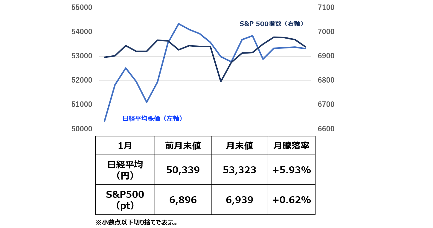 2026年1月の日経平均株価は大きく上昇しました。高市首相が衆議院を解散するとの報道を受け、高市政権の基盤が強化され、積極的な財政政策が推進されるとの期待が高まったことから、株価は上昇しました。一方、月末にかけてはグリーンランドを巡る対立などを背景にリスクセンチメントが悪化し、国内株式市場はやや軟調に推移しました。