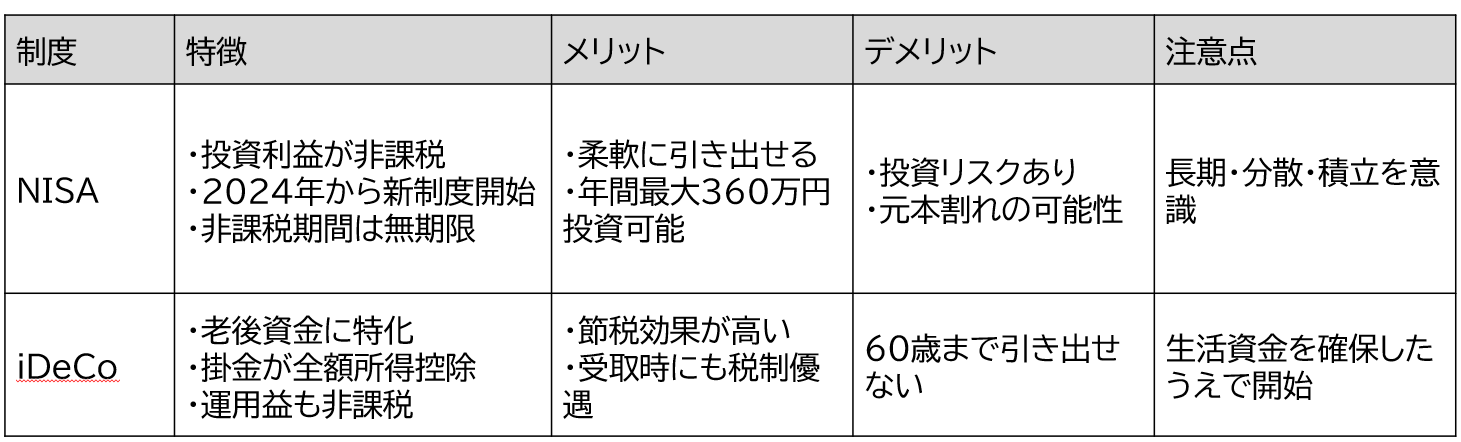 注意点として、NISAは投資リスクを伴うため、長期・分散・積立を意識すること。iDeCoは引き出し制限があるため、生活資金を確保したうえで始めましょう。