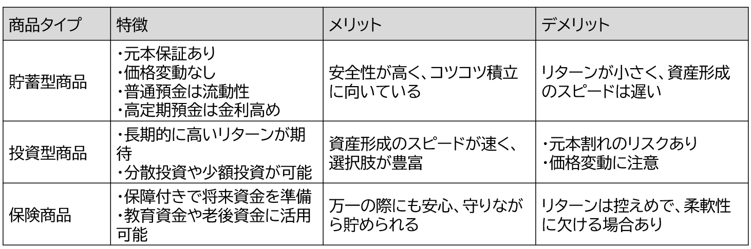 資産形成を始めるとき、どんな金融商品を選ぶかは大きなポイントです。「とりあえず貯金」も悪くありませんが、目的やリスク許容度によって選択肢は大きく変わります。ここでは、代表的な3つのカテゴリーをご紹介します。