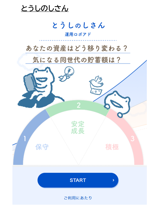 ここで便利なのが、運用ロボアド「とうしのしさん」。チャット形式で質問に答えるだけで、自分の運用タイプ(保守型・安定成長型・積極型)を診断できます。診断結果をもとに、短期資金は定期預金や個人向け国債、長期資金はつみたてNISAでインデックスファンドといった配分を決めましょう。
