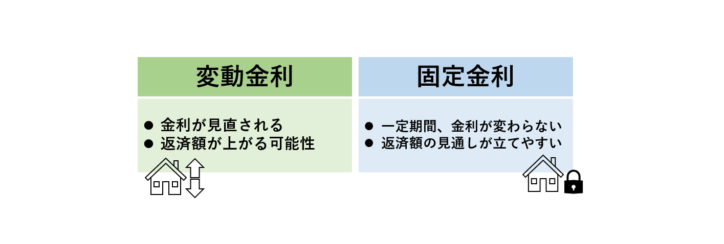 ※なお、固定金利には、返済期間中ずっと金利が変わらない「全期間固定型」と、一定期間だけ金利が固定される「固定金利期間選択型」があります。